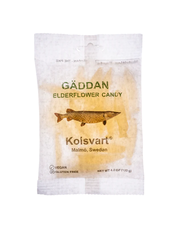 Kolsvart Gäddan Elderflower Candy Fish captures the delicate floral sweetness of elderflower in a soft, natural gummy inspired by traditional Swedish flavors.  With a satisfying chew, the elderflower flavor is sweet, but not overly so, and has a mild tartness that we love, plus that iconic fun fish shape.